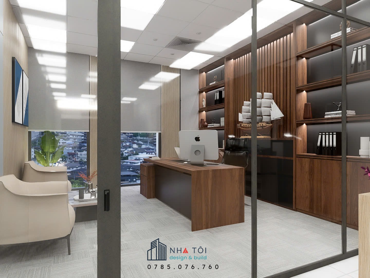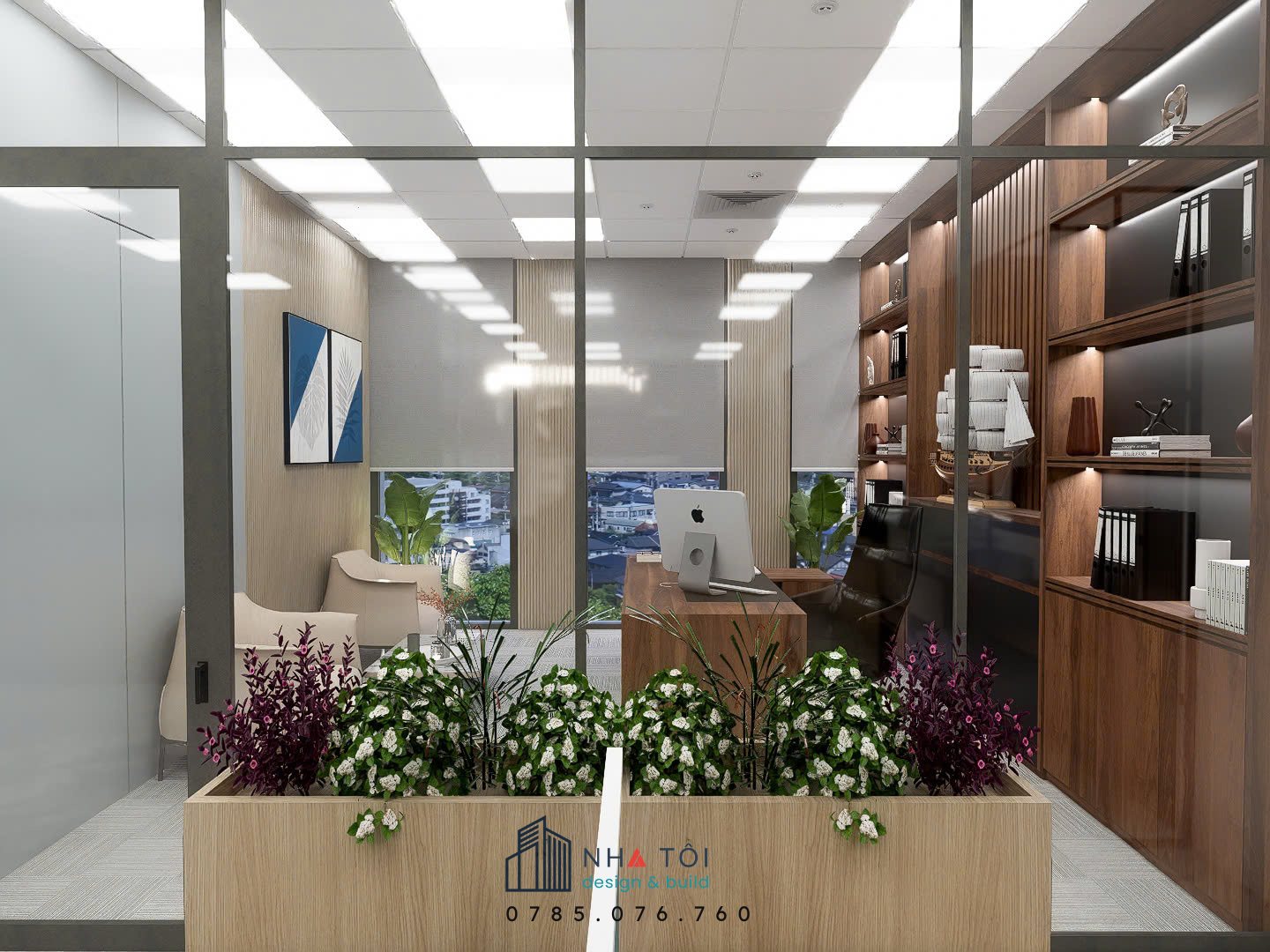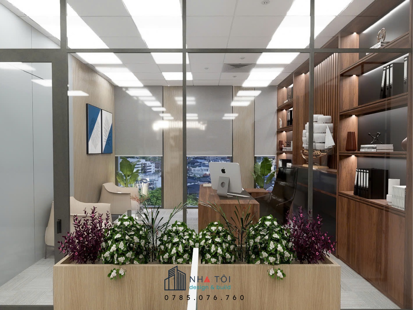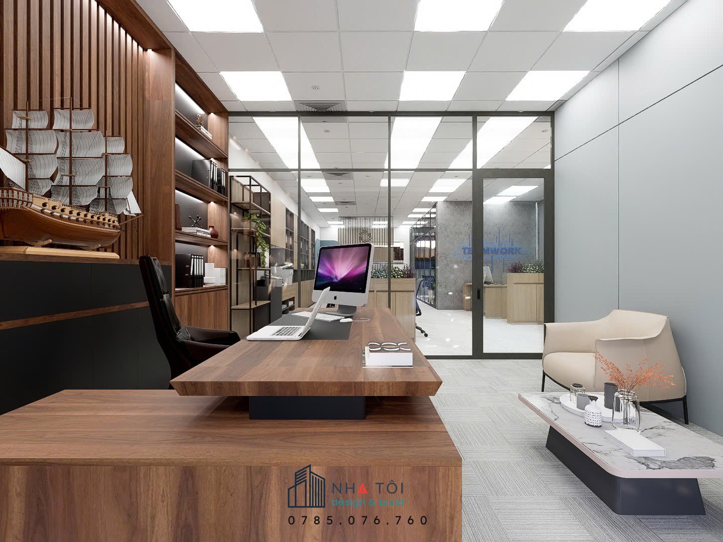 Văn phòng Công ty HLs được thiết kế theo phong cách hiện đại, tối giản nhưng vẫn sang trọng, mang đến không gian làm việc chuyên nghiệp và hiệu quả. Khu vực giám đốc nổi bật với bàn gỗ cao cấp, hệ tủ trưng bày kịch trần cùng điểm nhấn mô hình thuyền buồm, tạo cảm giác uy tín và tinh tế.