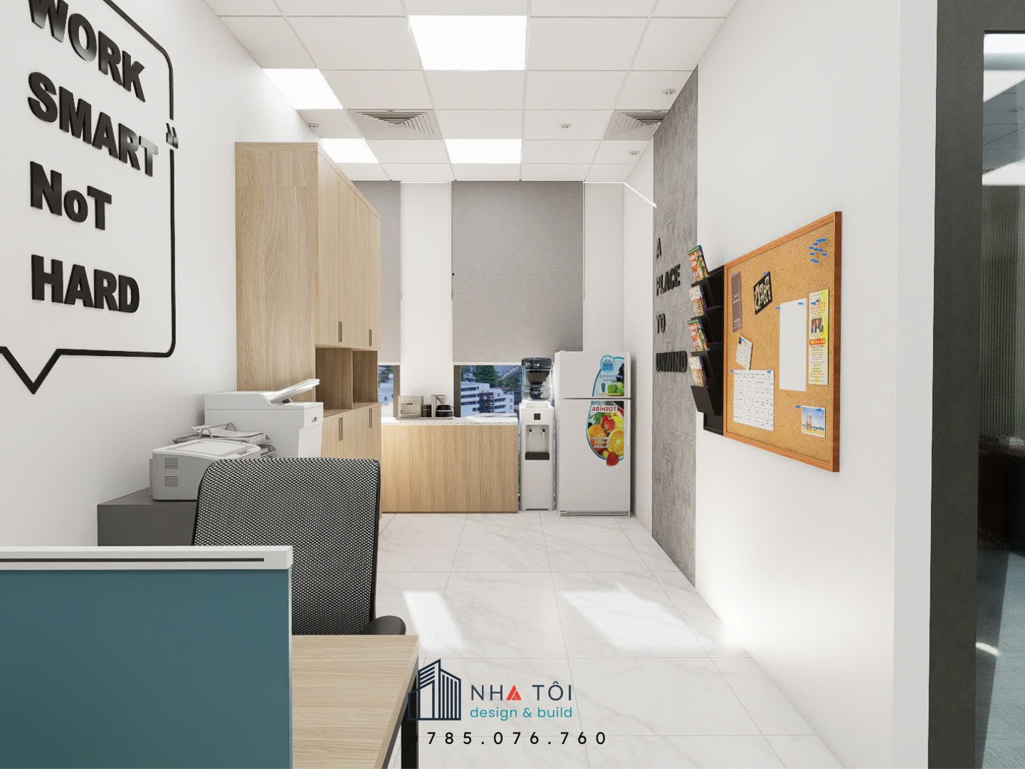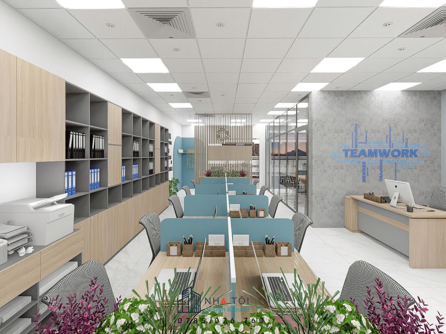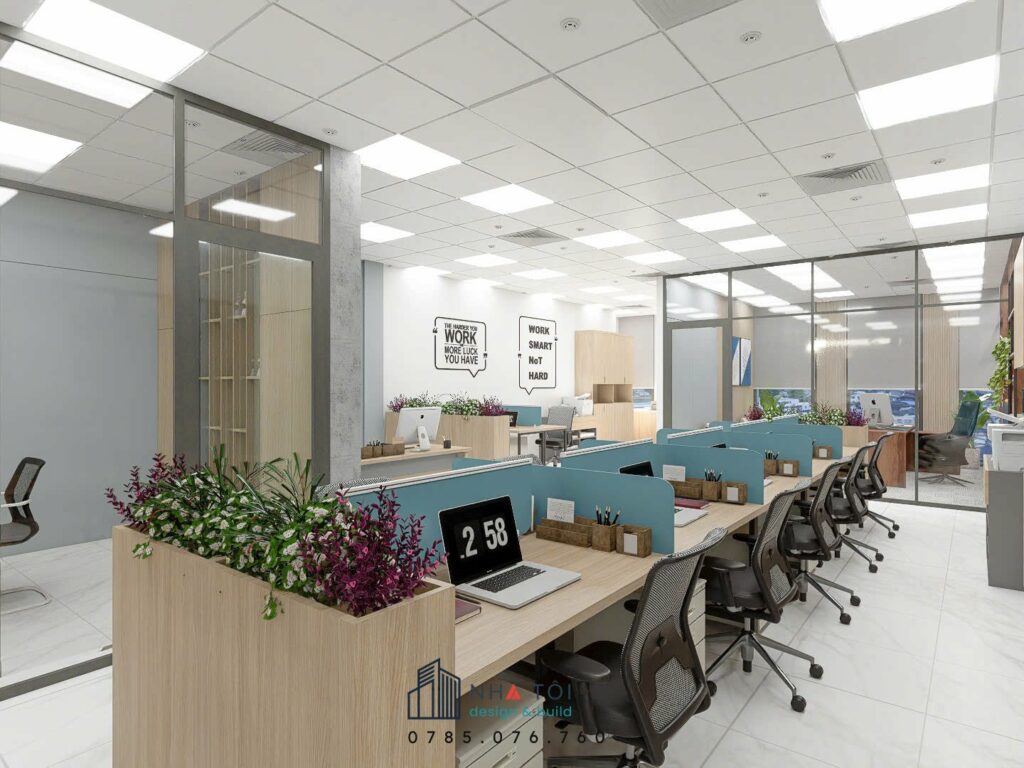 Không gian làm việc chung được bố trí với cụm bàn có vách ngăn thấp, ghế lưới hiện đại và hệ tủ lưu trữ hồ sơ gọn gàng. Tường văn phòng được nhấn bằng slogan “WORK SMART NOT HARD” và cụm chữ “TEAMWORK”, khẳng định tinh thần gắn kết.
